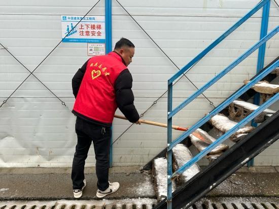 动员令一出,项目部党员、管理人员、劳务班组负责人、物业及后勤人员迅速响应,奔赴结冰严重的区域。志愿者们分工协作,默契配合,有的奋力破开坚冰,有的及时清理碎冰。经过高效奋战,一条条被冰层覆盖的通道重新恢复安全畅通。
